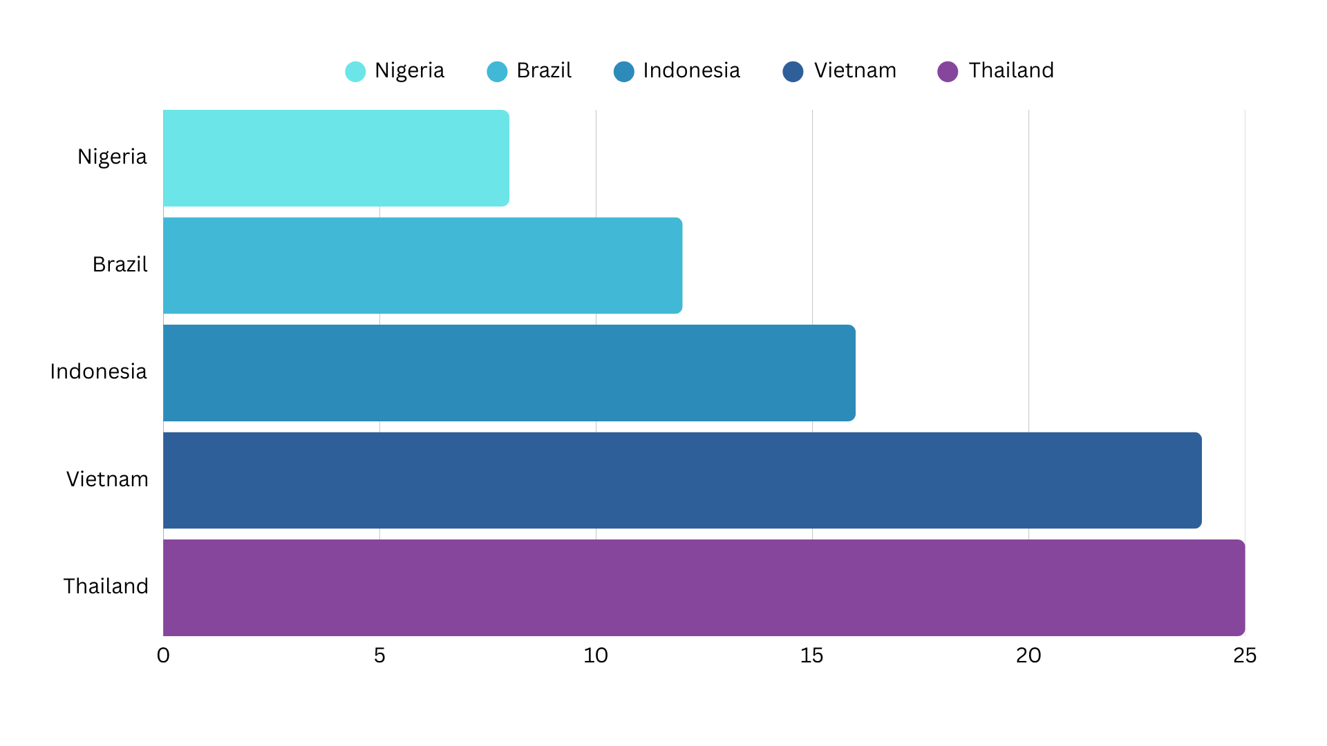 Nigeria, Africa’s largest cassava producer, rounds out the top five. Although much of its cassava is used locally, the country has begun exporting modified cassava starch to meet international demand. With over 50 million tons of cassava produced annually, Nigeria’s potential is immense. However, challenges like limited processing infrastructure and reliance on raw exports mean it trails behind Asia’s giants. Still, its growing export market signals a promising future.